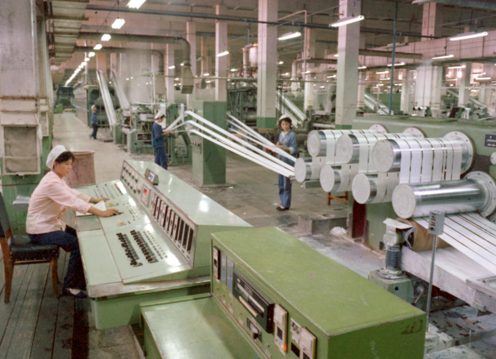 1981年,東北遼陽石油化學纖維廠抽絲車間一角。新華社發(fā)