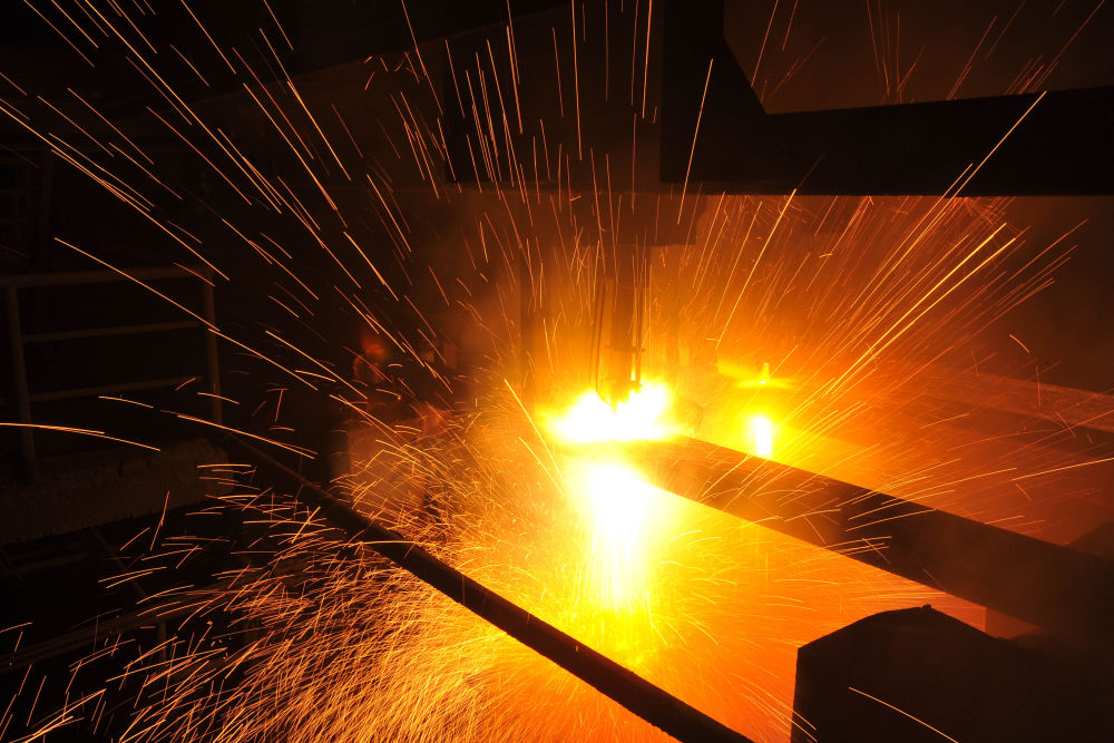 2015年3月10日,東北特鋼集團大連基地生產的合金鋼連鑄坯進行定尺切割。新華社發(fā)
