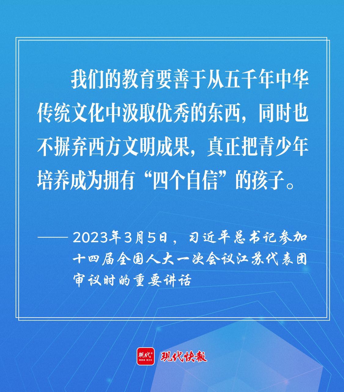 2023年3月5日,習(xí)近平總書(shū)記參加十四屆全國(guó)人大一次會(huì)議江蘇代表團(tuán)審議時(shí),勉勵(lì)教育工作者“要善于從五千年中華傳統(tǒng)文化中汲取優(yōu)秀的東西,同時(shí)也不摒棄西方文明成果,真正把青少年培養(yǎng)成為擁有‘四個(gè)自信’的孩子。”