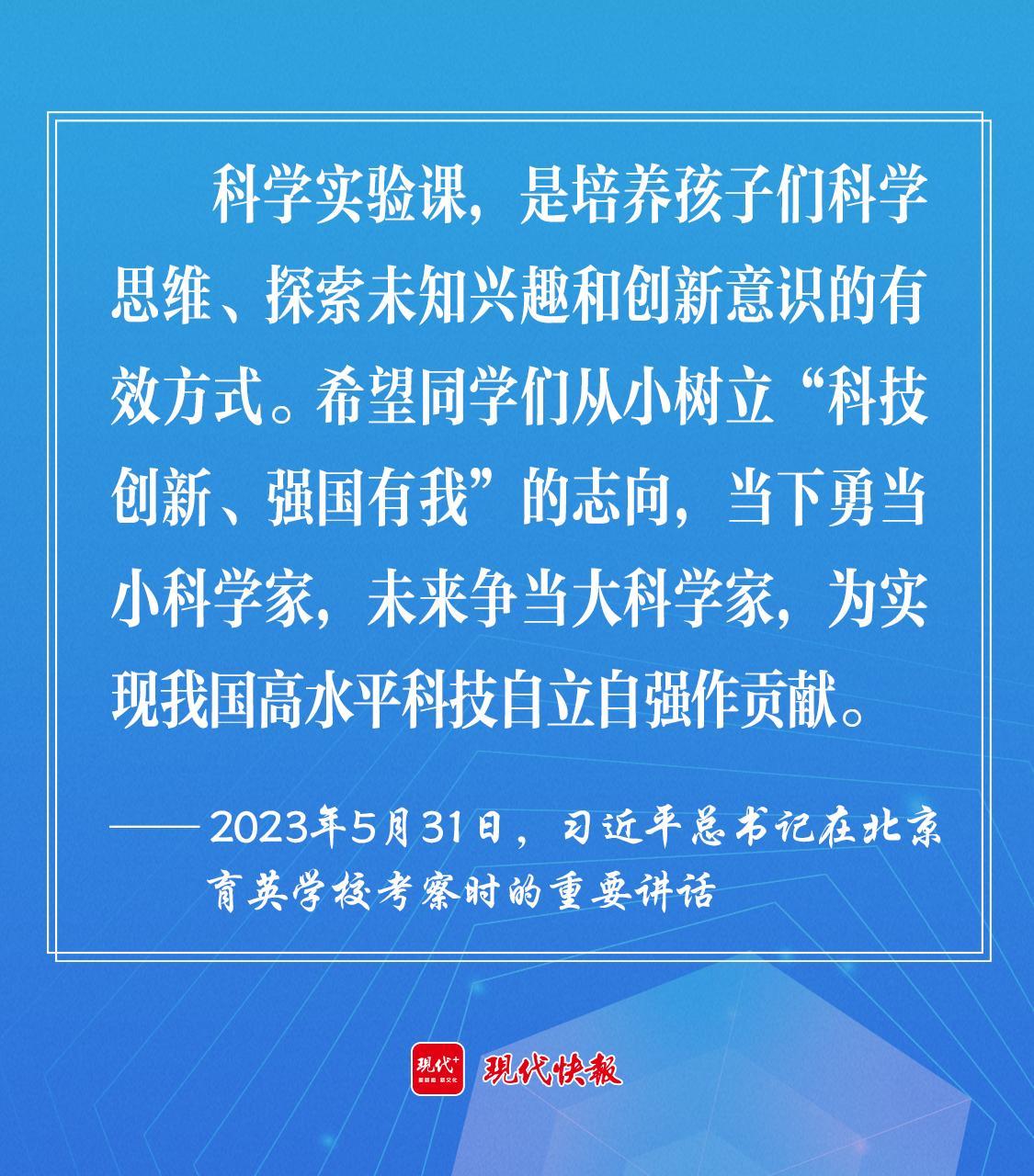 2023年5月,習(xí)近平總書(shū)記在北京育英學(xué)校考察時(shí)強(qiáng)調(diào),希望同學(xué)們從小樹(shù)立“科技創(chuàng)新、強(qiáng)國(guó)有我”的志向,當(dāng)下勇當(dāng)小科學(xué)家,未來(lái)爭(zhēng)當(dāng)大科學(xué)家,為實(shí)現(xiàn)我國(guó)高水平科技自立自強(qiáng)作貢獻(xiàn)。