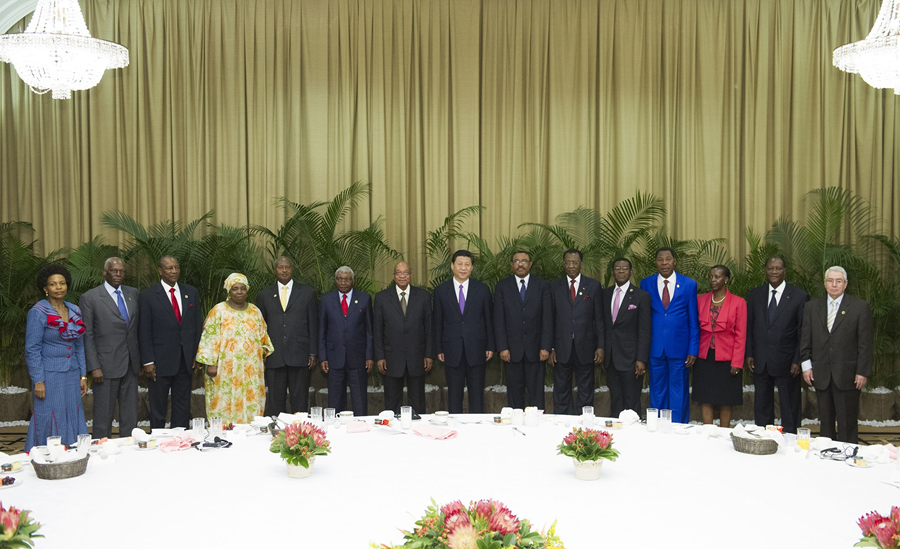 圖為2013年3月28日,國家主席習(xí)近平在南非德班同非洲國家領(lǐng)導(dǎo)人早餐會合影。新華社發(fā)