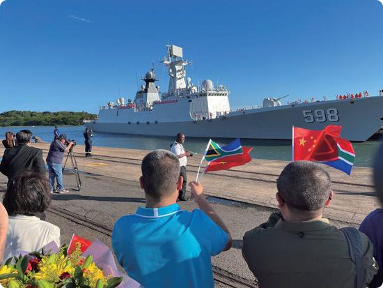 △聯(lián)合演習開始前一天,中國海軍日照艦抵達南非理查茲灣港口,受到歡迎