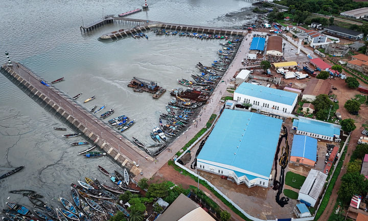 這是2024年7月8日在幾內(nèi)亞比紹首都比紹拍攝的板丁漁業(yè)碼頭和中企投建的水產(chǎn)品加工存儲綜合設(shè)施(右側(cè)藍(lán)頂建筑區(qū)域)(無人機(jī)照片)。新華社記者 韓旭 攝