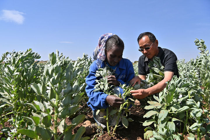 2023年9月27日,在位于厄立特里亞阿斯馬拉的農(nóng)業(yè)技術(shù)援助項(xiàng)目示范地,中國援厄第三期高級農(nóng)業(yè)專家組豆類作物專家劉運(yùn)民(右)指導(dǎo)當(dāng)?shù)剞r(nóng)戶進(jìn)行蠶豆作物的田間管理。新華社記者 韓旭 攝
