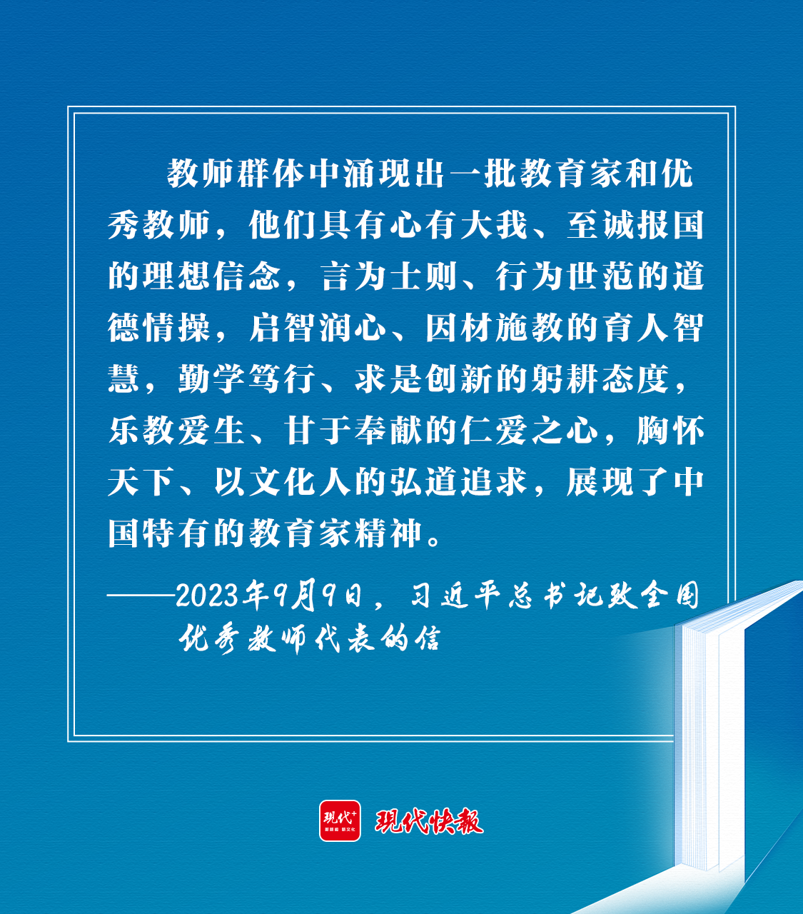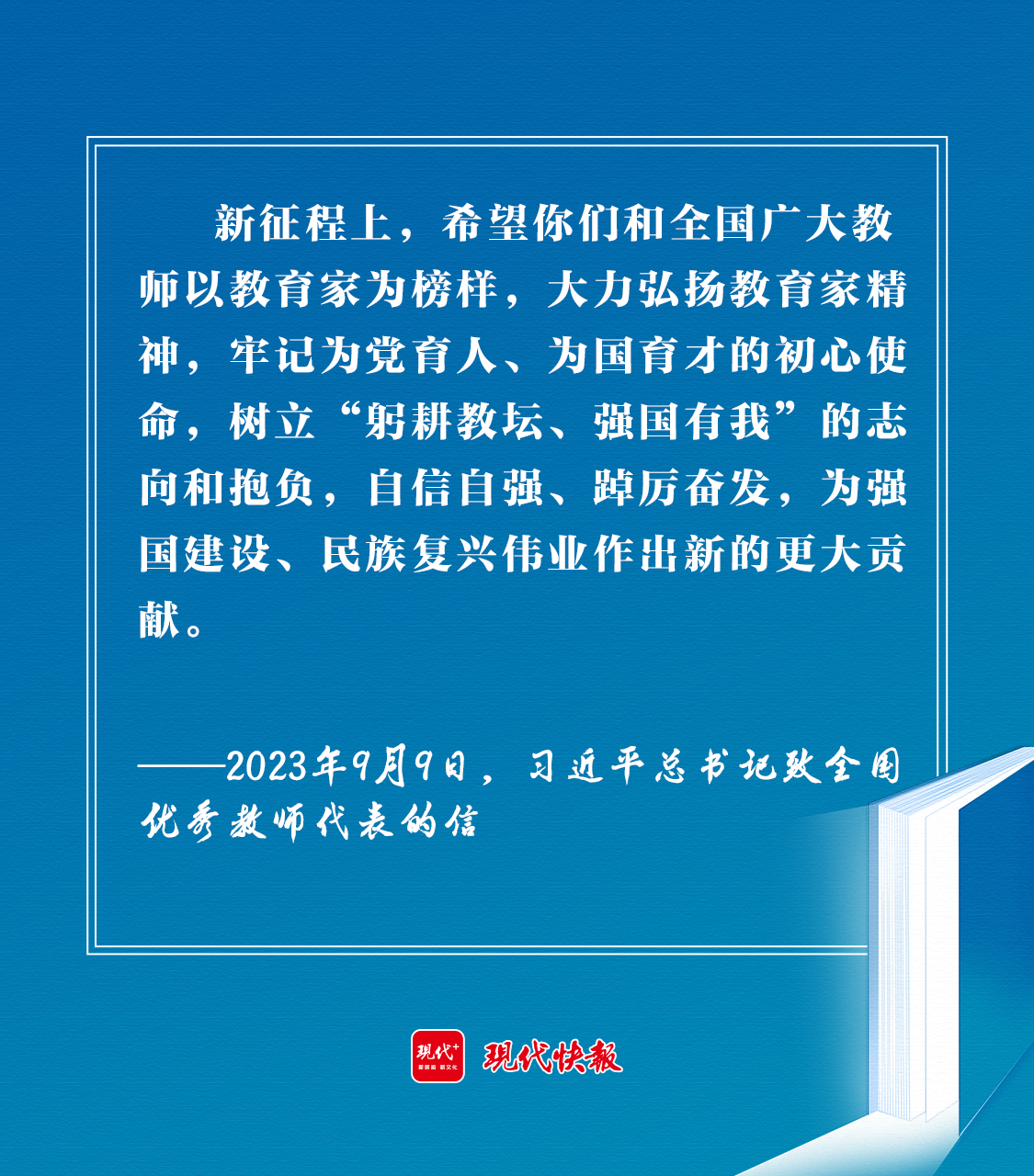 2023年9月9日,習(xí)近平總書記在致全國優(yōu)秀教師代表的信中強(qiáng)調(diào):“新征程上,希望你們和全國廣大教師以教育家為榜樣,大力弘揚(yáng)教育家精神,牢記為黨育人、為國育才的初心使命,樹立‘躬耕教壇、強(qiáng)國有我’的志向和抱負(fù),自信自強(qiáng)、踔厲奮發(fā),為強(qiáng)國建設(shè)、民族復(fù)興偉業(yè)作出新的更大貢獻(xiàn)?!?/p>