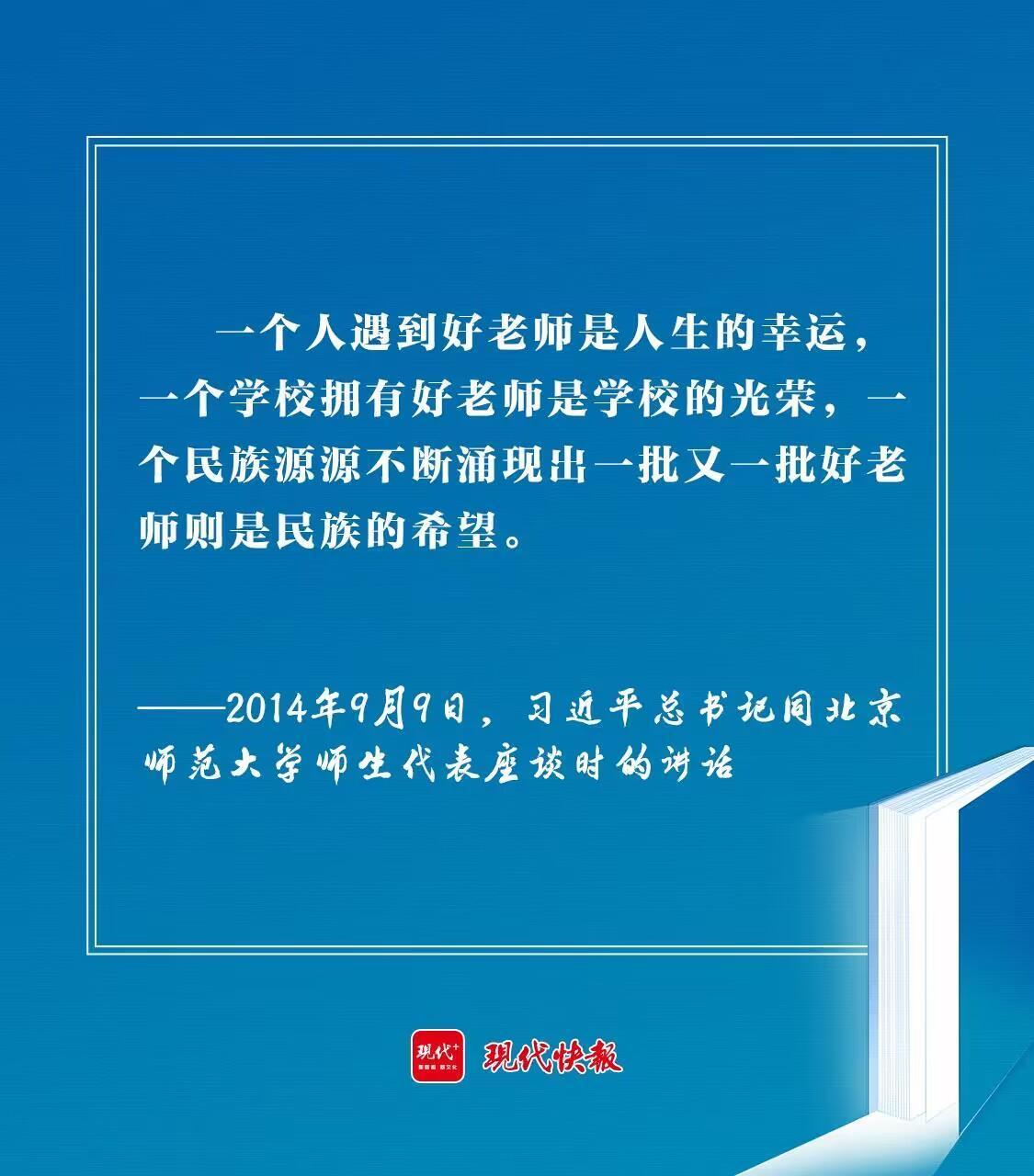 “一個人遇到好老師是人生的幸運(yùn),一個學(xué)校擁有好老師是學(xué)校的光榮,一個民族源源不斷涌現(xiàn)出一批又一批好老師則是民族的希望?!?014年教師節(jié)前夕,同北京師范大學(xué)師生代表座談時,習(xí)近平總書記的殷殷期盼,激勵廣大教師為民族復(fù)興拼搏奮斗。