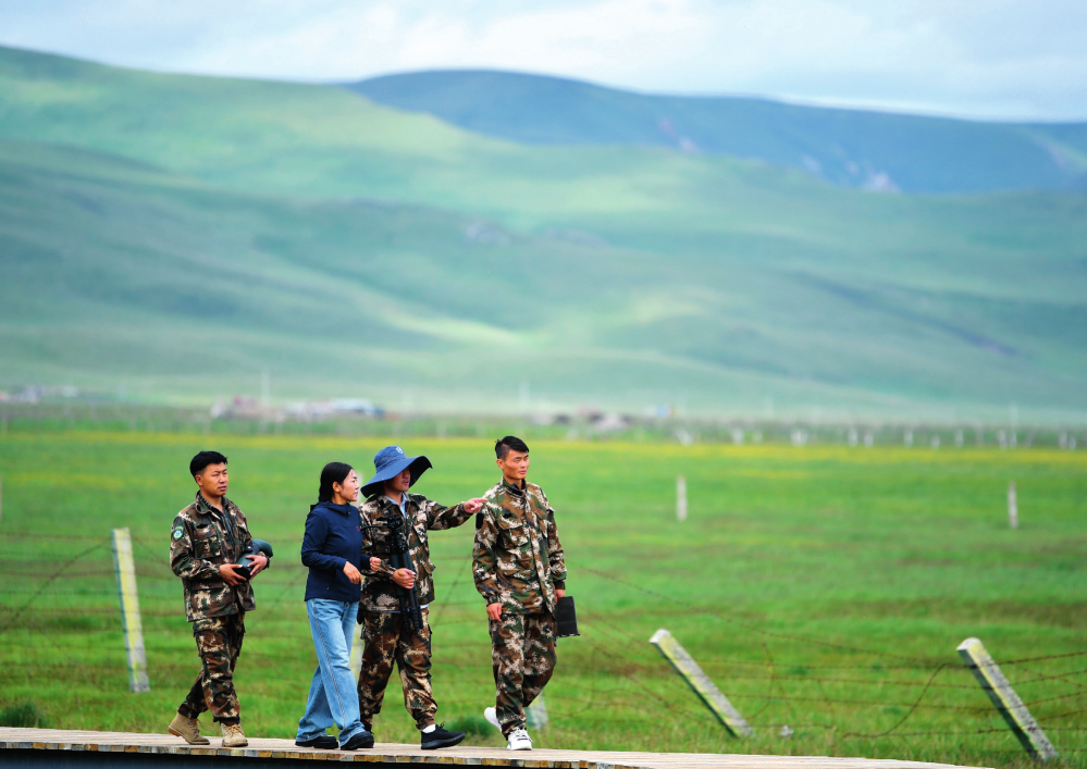 甘肅尕海則岔國(guó)家級(jí)自然保護(hù)區(qū)管護(hù)中心尕海保護(hù)站站長(zhǎng)香毛吉 ( 左二)和同事在保護(hù)區(qū)內(nèi)巡護(hù)(2023 年 7 月 7 日攝)陳斌攝 / 本刊