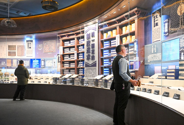 2023年12月23日,參觀(guān)者在北京民族文化宮參觀(guān)鑄牢中華民族共同體意識(shí)文物古籍展。新華社記者 郝建偉 攝