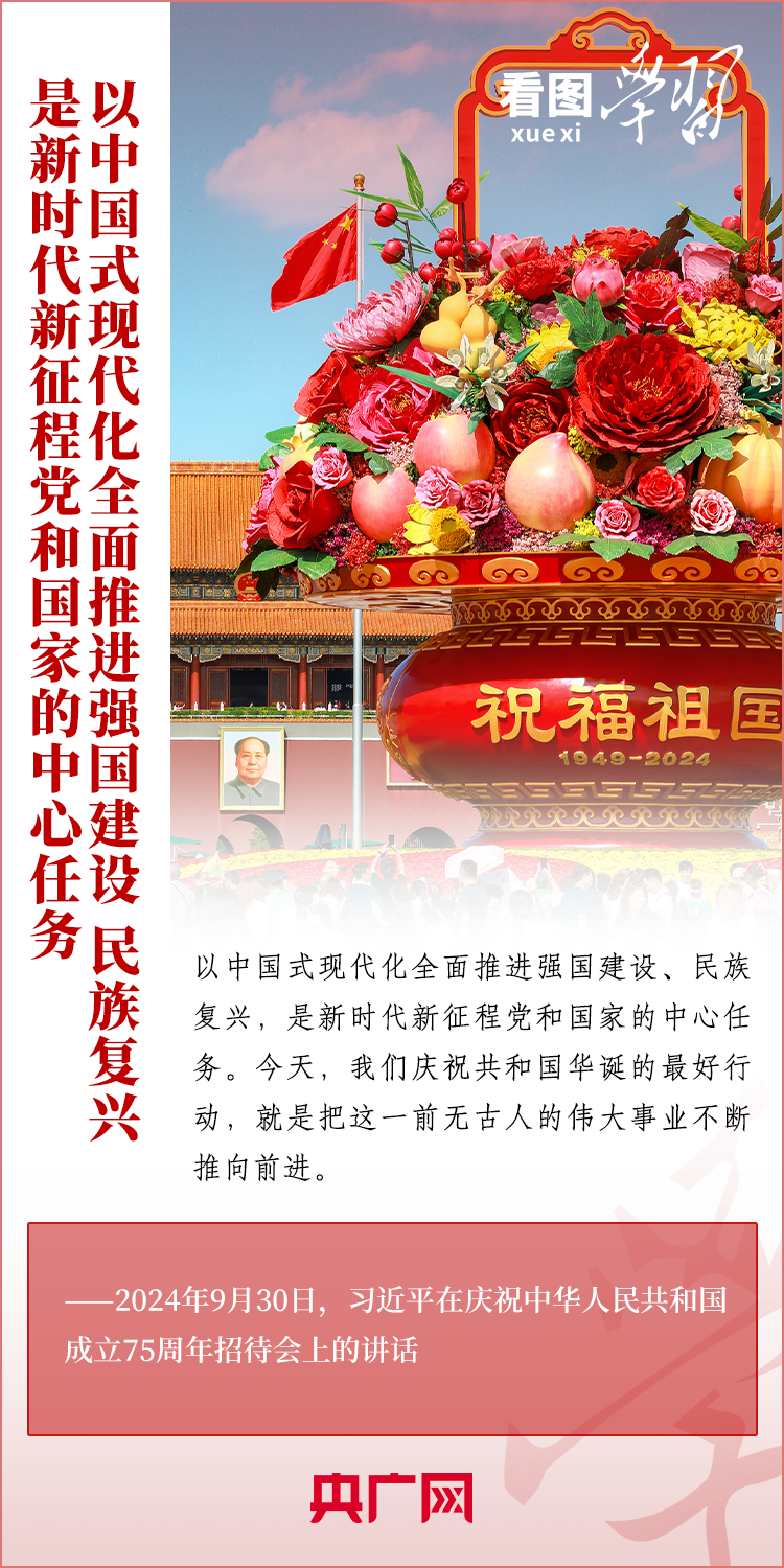 “經(jīng)過(guò)75年的艱苦奮斗,中國(guó)式現(xiàn)代化已經(jīng)展開(kāi)壯美畫(huà)卷并呈現(xiàn)出無(wú)比光明燦爛的前景?!?月30日,慶祝中華人民共和國(guó)成立75周年招待會(huì)在京舉行。習(xí)近平總書(shū)記出席招待會(huì)并發(fā)表重要講話(huà)??倳?shū)記強(qiáng)調(diào),以中國(guó)式現(xiàn)代化全面推進(jìn)強(qiáng)國(guó)建設(shè)、民族復(fù)興,是新時(shí)代新征程黨和國(guó)家的中心任務(wù)。我們慶祝共和國(guó)華誕的最好行動(dòng),就是把這一前無(wú)古人的偉大事業(yè)不斷推向前進(jìn)。