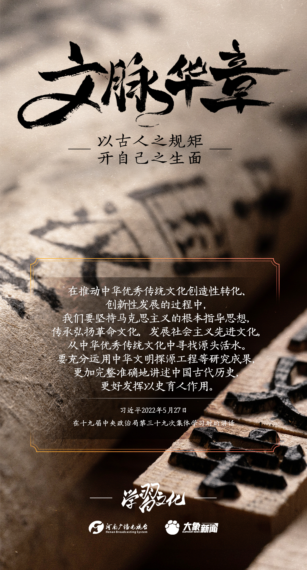 2014年10月15日,習(xí)近平總書記在文藝工作座談會上的重要講話指出:傳承中華文化,絕不是簡單復(fù)古,也不是盲目排外,而是古為今用、洋為中用,辯證取舍、推陳出新,摒棄消極因素,繼承積極思想,“以古人之規(guī)矩,開自己之生面”,實現(xiàn)中華文化的創(chuàng)造性轉(zhuǎn)化和創(chuàng)新性發(fā)展。