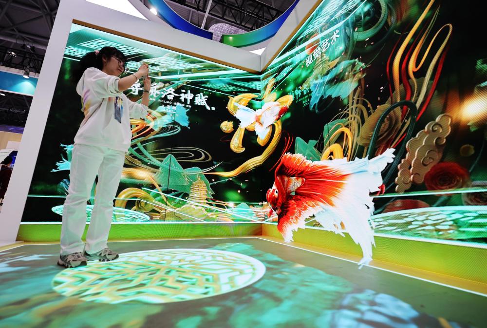 2024年4月1日,在安徽合肥舉辦的2024國際顯示技術(shù)大會上,一名觀眾體驗京東方展出的裸眼3D快速拆裝折角屏。