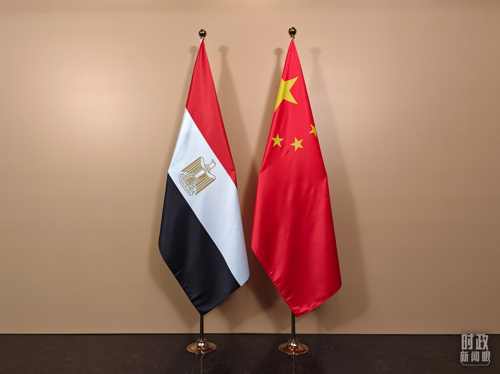 會(huì)見廳外的中國(guó)埃及兩國(guó)國(guó)旗。(總臺(tái)央視記者彭漢明拍攝)