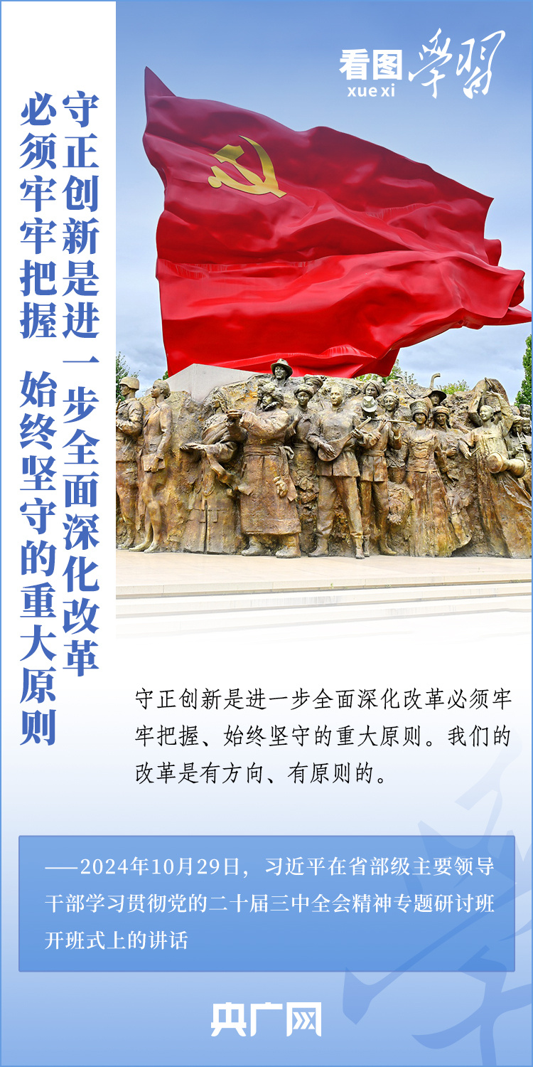 改革只有進行時,沒有完成時。10月29日,省部級主要領(lǐng)導(dǎo)干部學(xué)習(xí)貫徹黨的二十屆三中全會精神專題研討班在中央黨校(國家行政學(xué)院)開班。習(xí)近平總書記發(fā)表重要講話,就進一步全面深化改革的一系列重大問題進行深刻闡釋,強調(diào)要牢牢把握、始終堅守“守正創(chuàng)新”這一重大原則,把握好“四對關(guān)系”,奮力打開改革發(fā)展新天地。一起來學(xué)習(xí)!