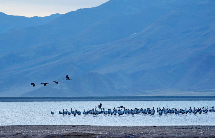 在雅魯藏布江中游河谷黑頸鶴國家級(jí)自然保護(hù)區(qū),黑頸鶴飛翔在一片水域上空(2024年3月17日攝)。多年來,西藏各級(jí)黨委政府和對(duì)口援藏省市接續(xù)投入2.4億余元資金開展生態(tài)建設(shè),創(chuàng)設(shè)的雅江北岸南木林生態(tài)示范區(qū)已完成造林4萬多畝,昔日戈壁荒灘漸變江畔綠洲,也成了黑頸鶴越冬的理想棲息地。監(jiān)測數(shù)據(jù)顯示,西藏境內(nèi)的黑頸鶴種群數(shù)量持續(xù)增長,已由上世紀(jì)的不足3000只增長到目前的1萬余只。