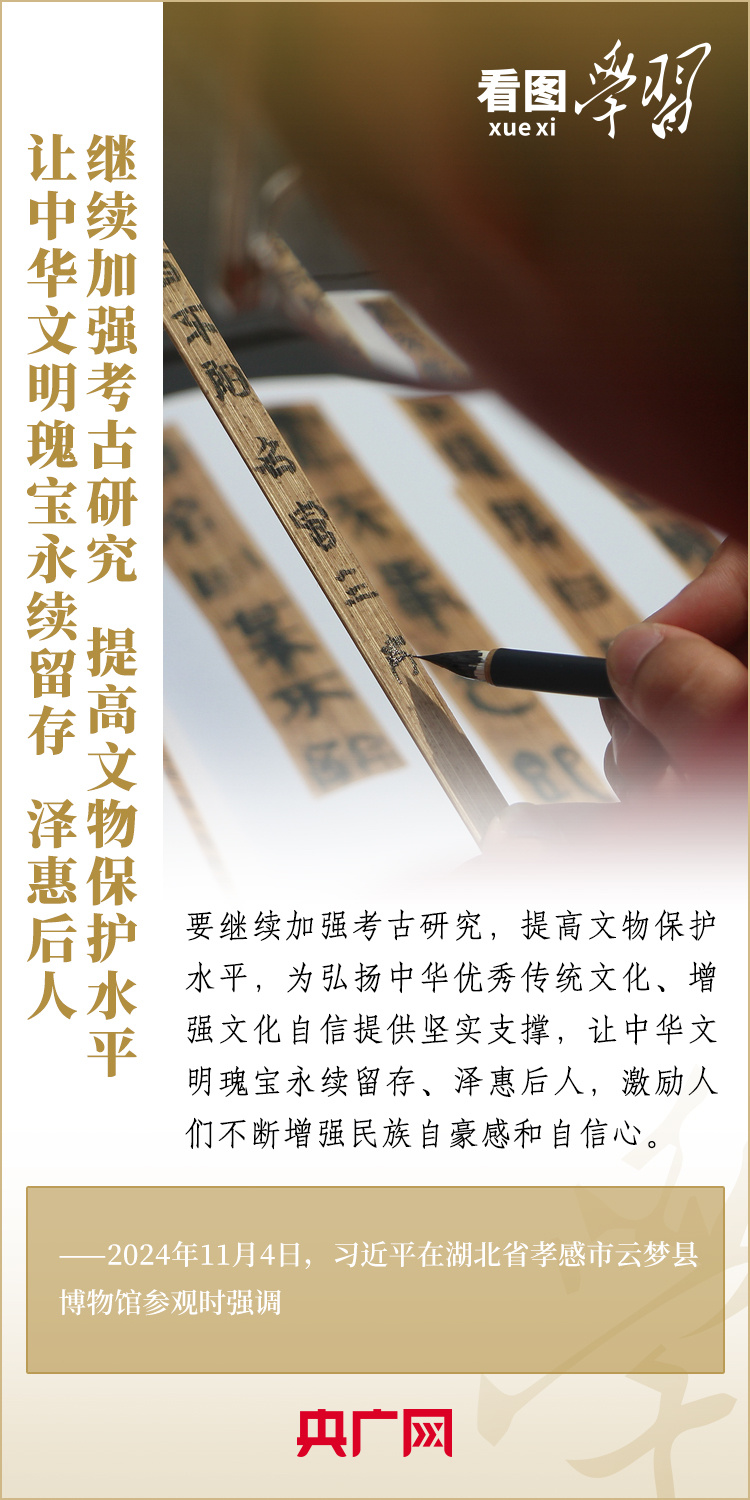 11月4日,習(xí)近平總書記在湖北省孝感市云夢(mèng)縣博物館參觀出土秦漢簡牘展。這里收藏的我國考古史上首次發(fā)現(xiàn)的秦簡——云夢(mèng)睡虎地秦簡,反映了戰(zhàn)國晚期到秦始皇時(shí)期的政治、經(jīng)濟(jì)、文化、法律、軍事等方面的情況。習(xí)總書記詳細(xì)聽取簡牘內(nèi)容、歷史文化價(jià)值和保護(hù)研究情況介紹,指出要繼續(xù)加強(qiáng)考古研究,提高文物保護(hù)水平,讓中華文明瑰寶永續(xù)留存、澤惠后人。