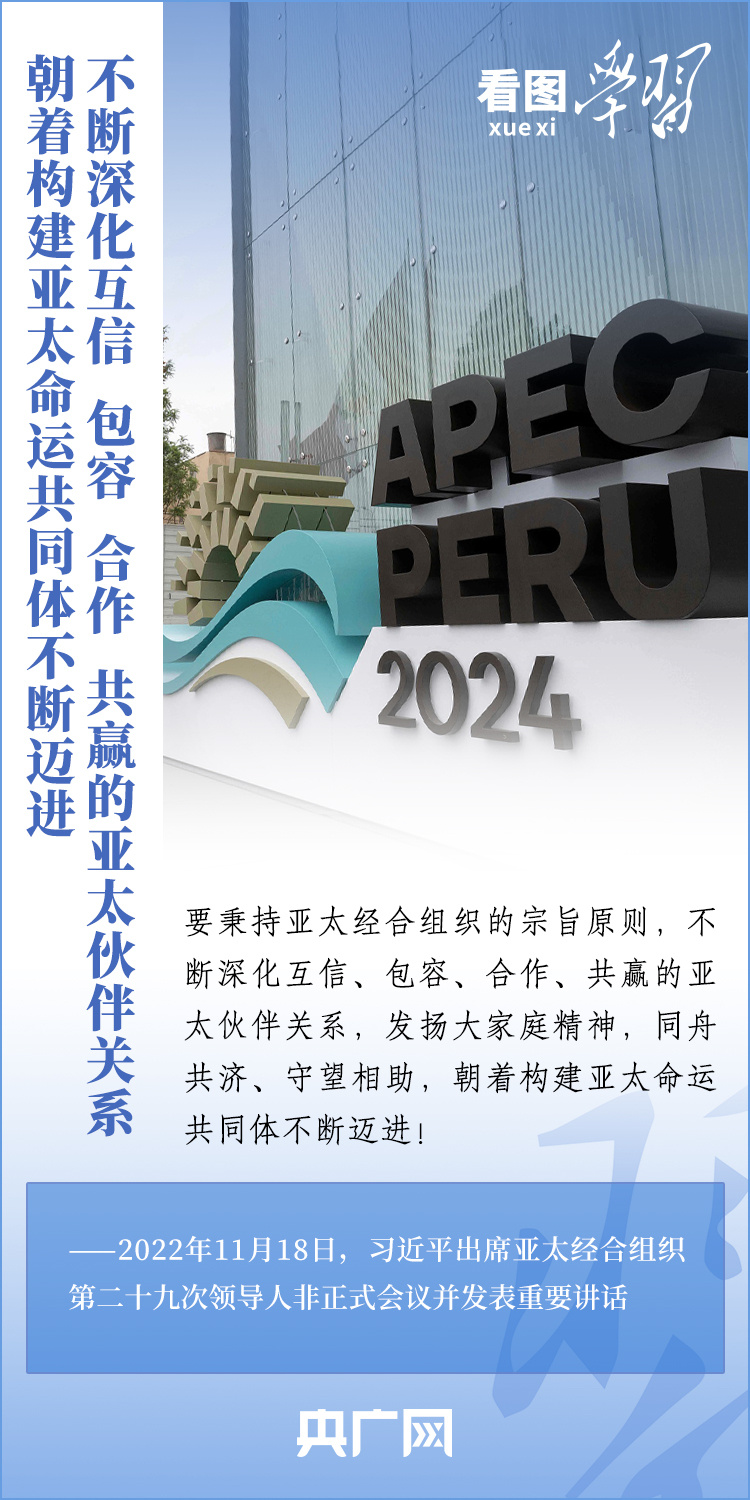 亞太經(jīng)合組織(APEC)是亞太地區(qū)層級最高、領(lǐng)域最廣、最具影響力的經(jīng)濟(jì)合作機制。11月13日至17日,習(xí)近平主席赴利馬出席亞太經(jīng)合組織第三十一次領(lǐng)導(dǎo)人非正式會議并對秘魯進(jìn)行國事訪問。從“亞太夢想”到“APEC方式”,從“亞太伙伴關(guān)系”到“亞太命運共同體”……2013年以來,習(xí)近平主席出席或主持歷次APEC領(lǐng)導(dǎo)人非正式會議,就全球及地區(qū)形勢、亞太區(qū)域合作、APEC未來發(fā)展等一系列重大問題闡釋中國主張,推動不斷深化互信、包容、合作、共贏的亞太伙伴關(guān)系,建設(shè)開放、活力、強韌、和平的亞太共同體。一起來學(xué)習(xí)!
