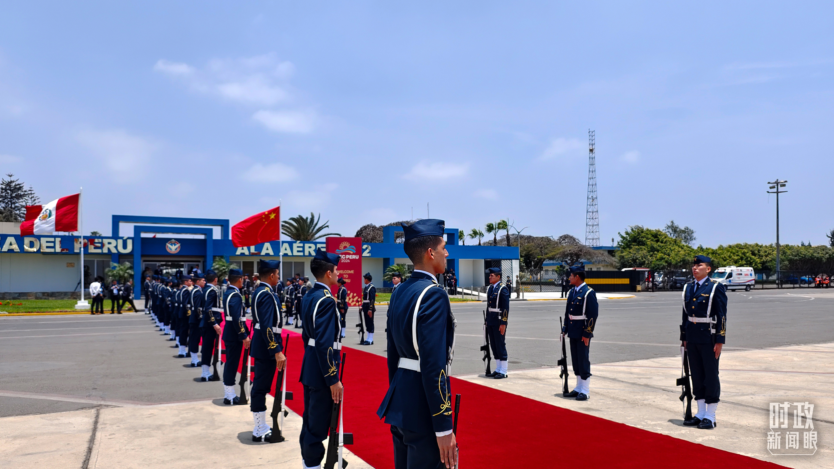 △利馬空軍基地,秘魯禮兵分列紅毯兩側(cè)迎接習(xí)主席到訪(fǎng)。(總臺(tái)央視記者韓銳拍攝)