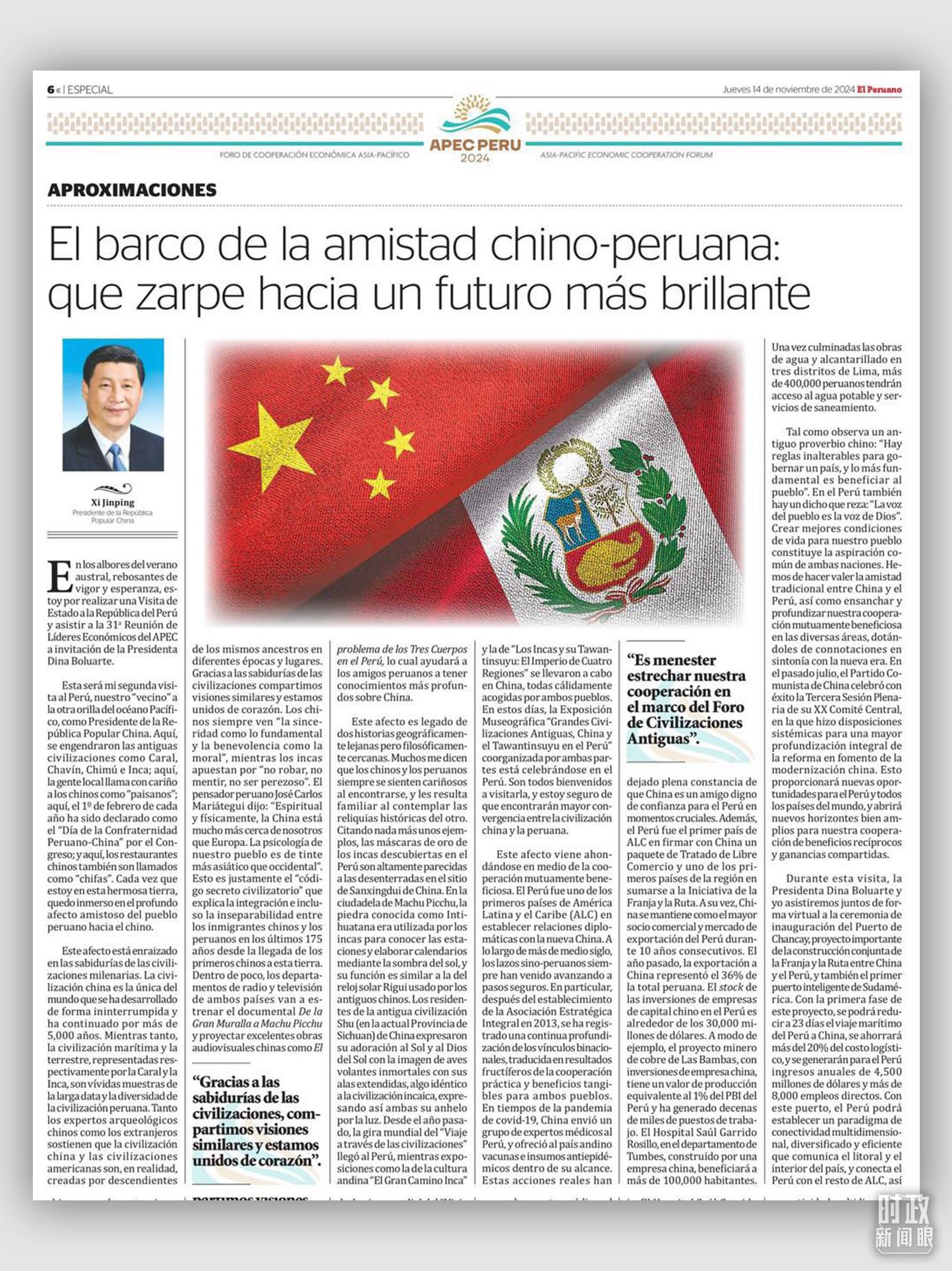 △習(xí)主席在《秘魯人報(bào)》發(fā)表題為《讓中秘友好之船揚(yáng)帆遠(yuǎn)航》的署名文章。(總臺(tái)國(guó)廣記者吳倩)