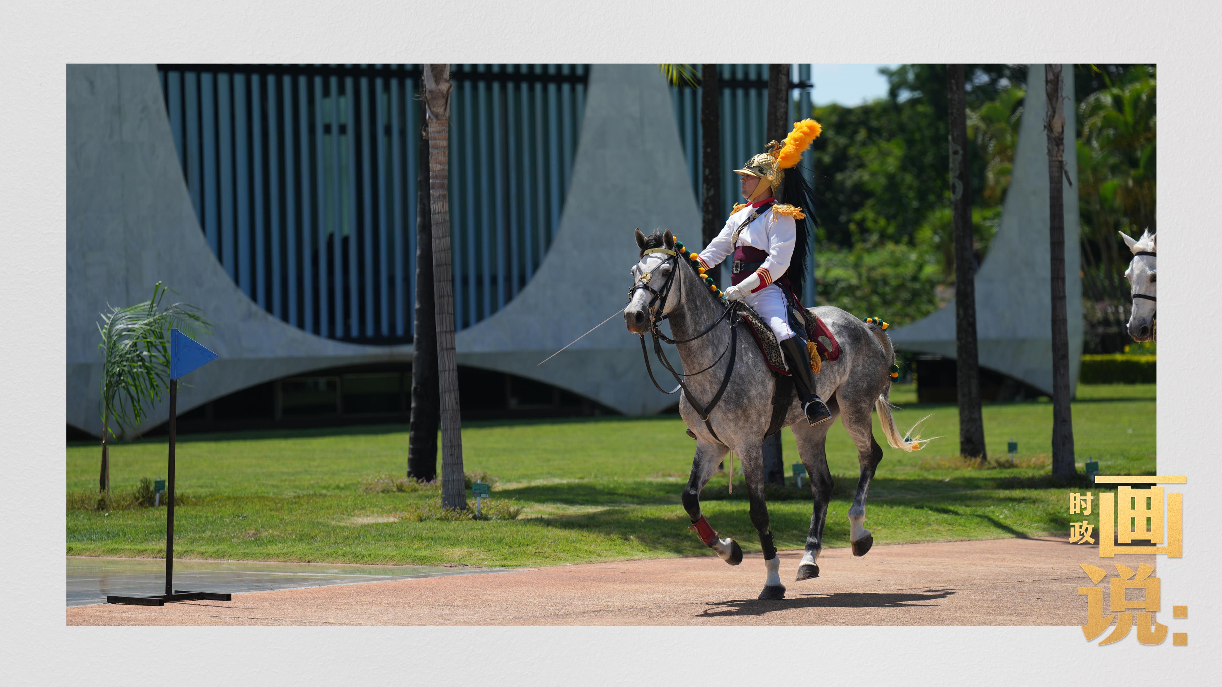 騎兵護衛(wèi)習近平主席專車抵達儀式現(xiàn)場,巴西藝術家用中文深情唱響中國經典民歌《我的祖國》,現(xiàn)場氣氛隆重熱烈。