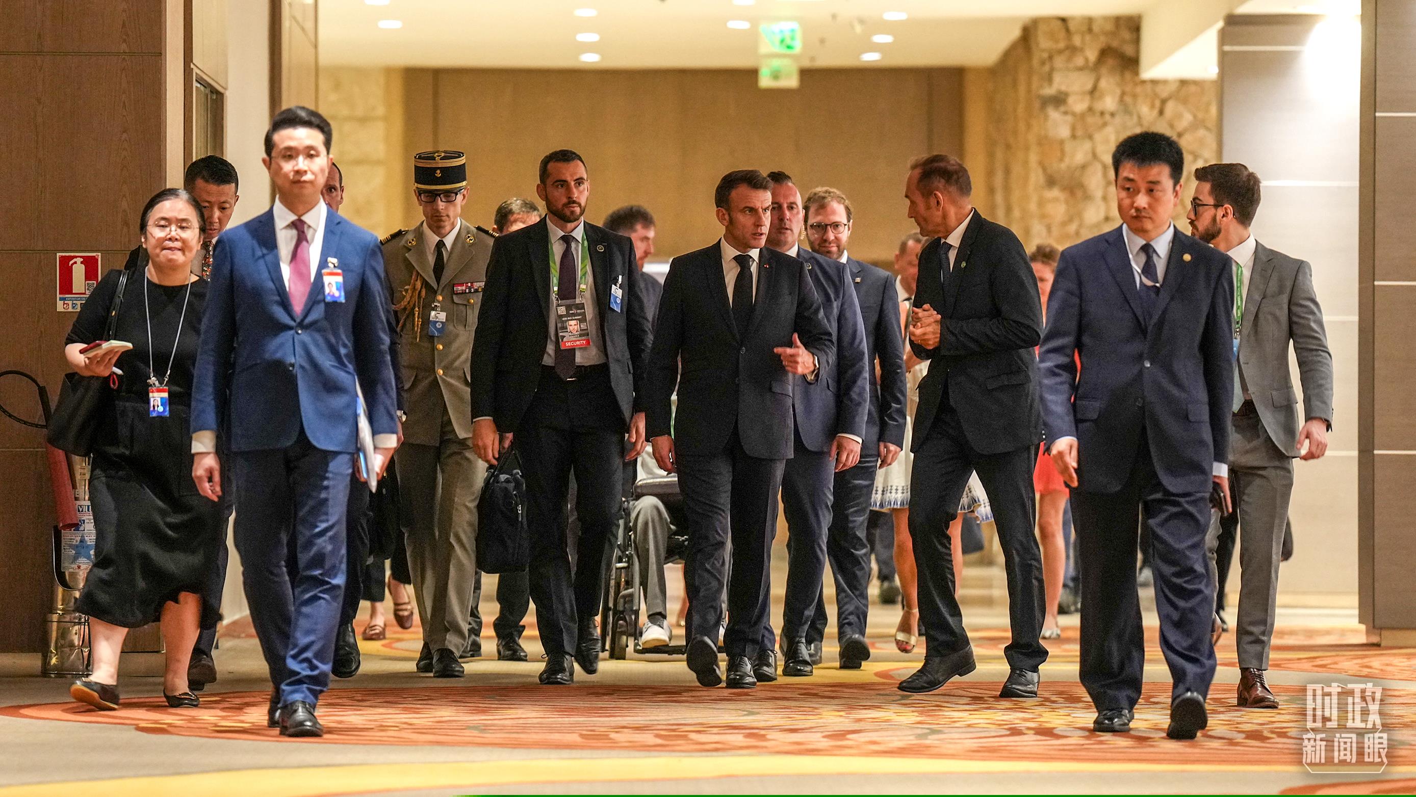 法國(guó)總統(tǒng)馬克龍前往會(huì)場(chǎng)。(總臺(tái)記者李晉拍攝)
