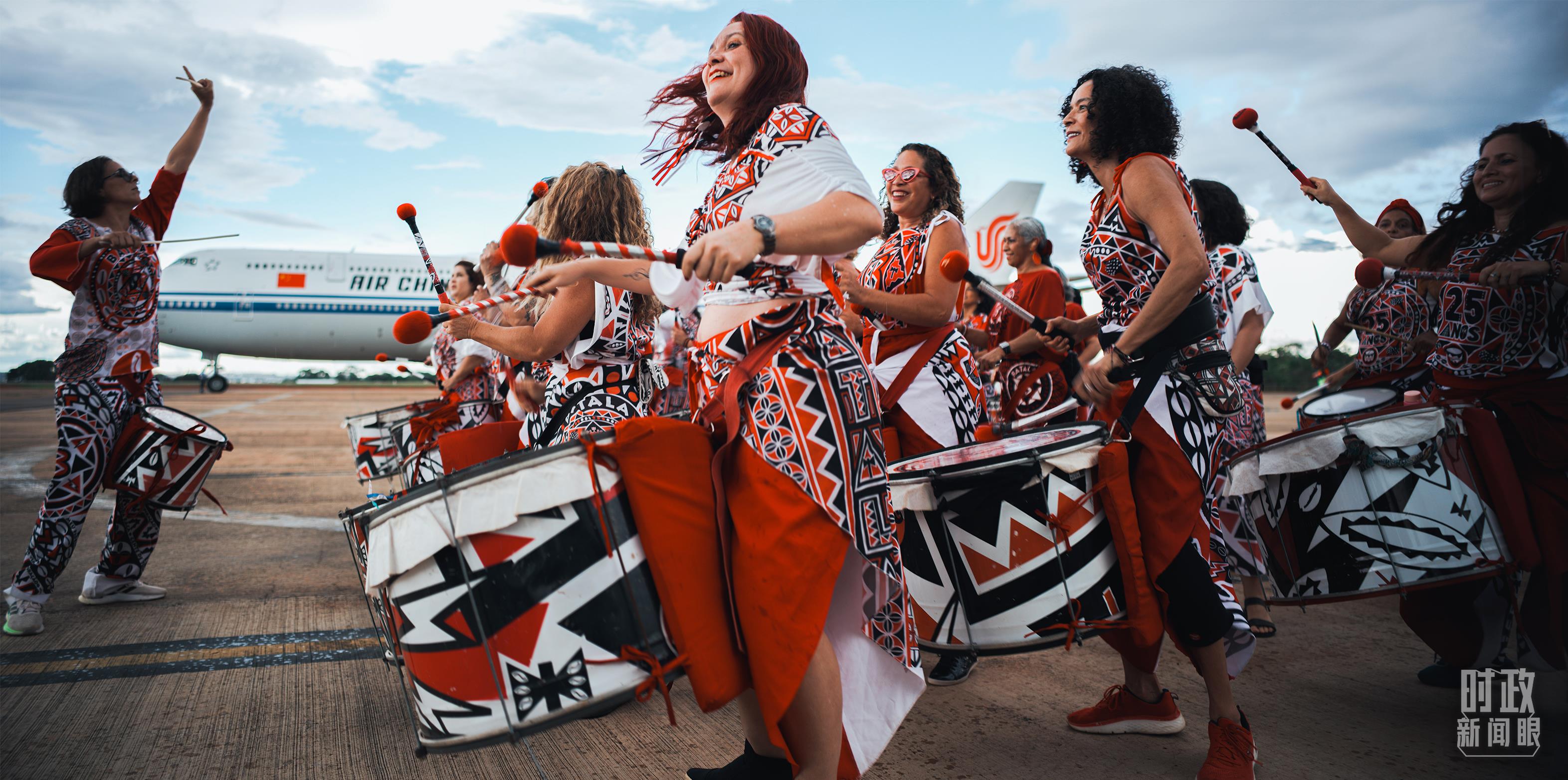習(xí)主席乘專(zhuān)機(jī)抵達(dá)巴西利亞,藝術(shù)家演奏特色鼓樂(lè)。(總臺(tái)央視記者彭漢明拍攝)
