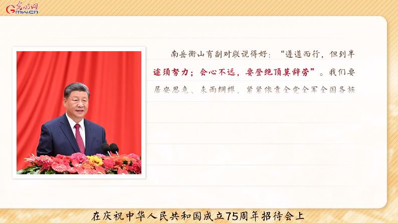 2024年是中華人民共和國成立75周年。9月30日,習(xí)近平總書記在慶祝中華人民共和國成立75周年招待會上的講話中引用南岳衡山的一副對聯(lián)“遵道而行,但到半途須努力;會心不遠(yuǎn),要登絕頂莫辭勞”,要求全黨同志居安思危、未雨綢繆,堅決戰(zhàn)勝一切不確定難預(yù)料的風(fēng)險挑戰(zhàn)。