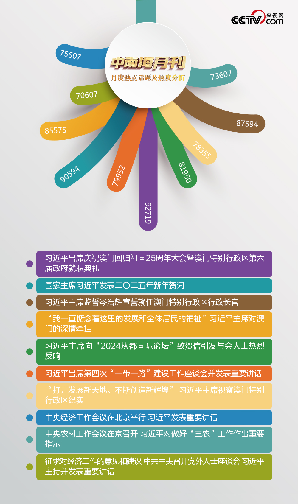 南海風起,百舸爭流。盛世蓮花,灼灼生華。央視網(wǎng)“智聞”系統(tǒng)提取分析2024年12月全網(wǎng)時政新聞熱點,習近平主席澳門之行吸引全網(wǎng)關(guān)注。