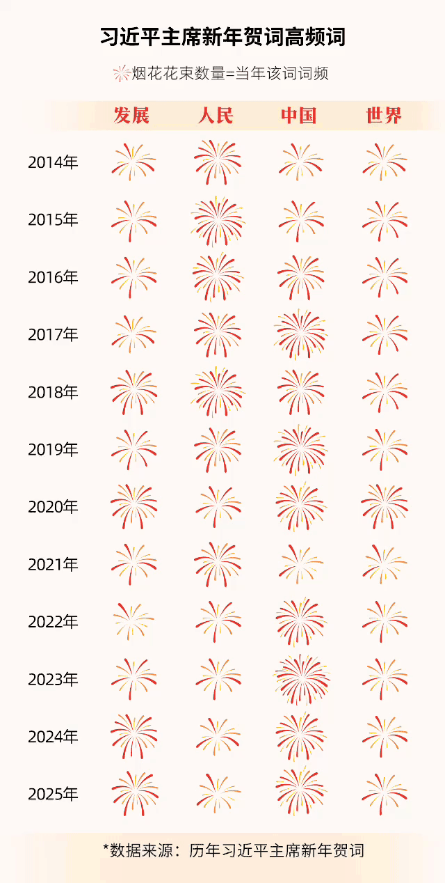 從高頻詞分析結果來看,“發(fā)展”“人民”“中國”“世界”是他每年新年賀詞都會強調的詞語。