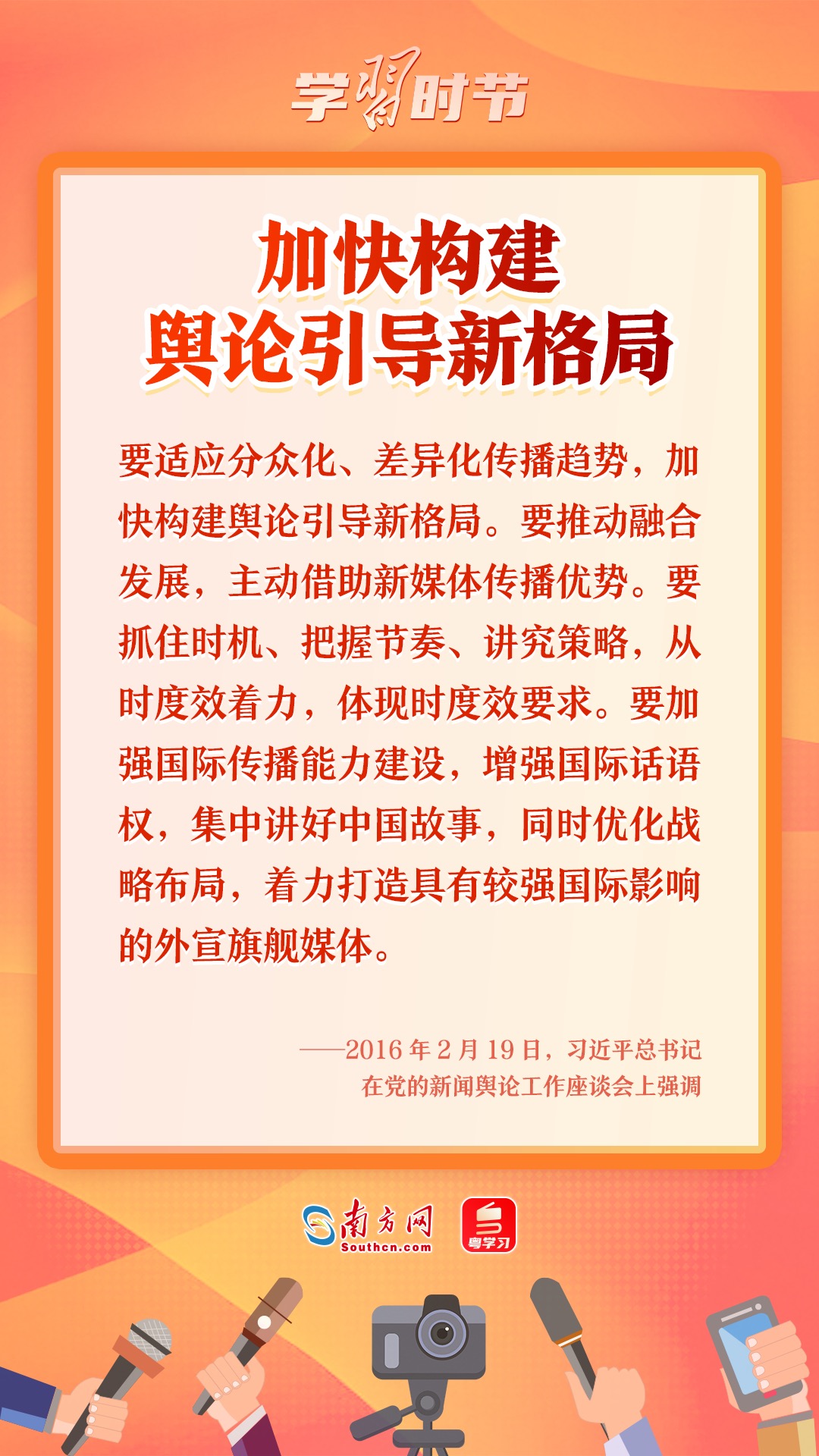 2016年2月19日,習(xí)近平總書記主持召開黨的新聞輿論工作座談會并發(fā)表重要講話。他強(qiáng)調(diào),“黨的新聞輿論工作是黨的一項(xiàng)重要工作,是治國理政、定國安邦的大事”。