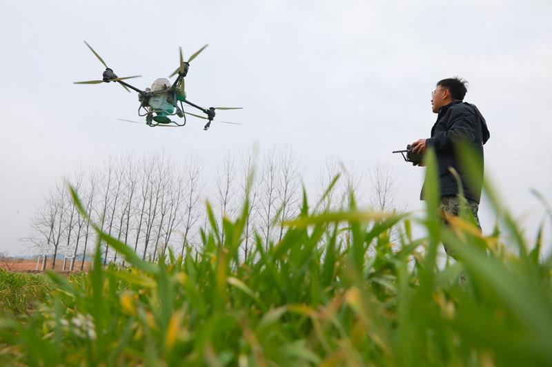 2025年2月14日,在浙江杭州市臨安區(qū)天目山鎮(zhèn)“天目糧倉”糧食功能區(qū),農機人員遙控植保無人機給小麥施肥。