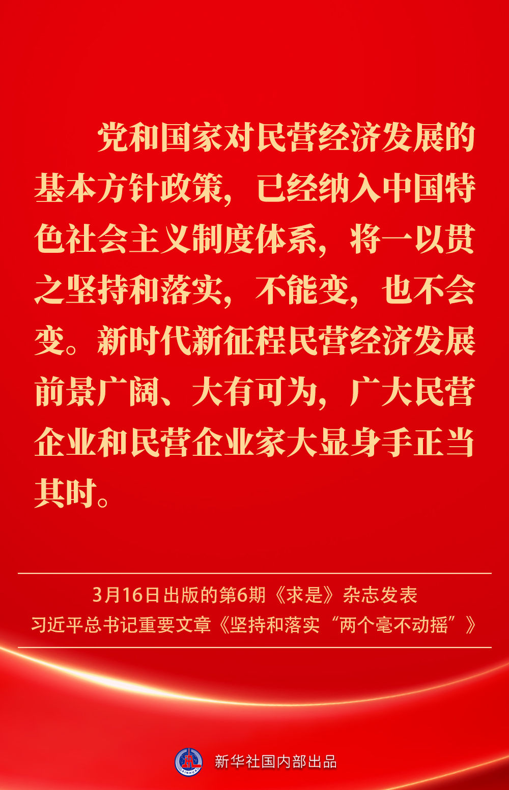 3月16日出版的第6期《求是》雜志發(fā)表習(xí)近平總書記重要文章《堅(jiān)持和落實(shí)“兩個(gè)毫不動(dòng)搖”》。這是習(xí)近平總書記2013年11月至2025年2月期間有關(guān)重要論述的節(jié)錄。如何認(rèn)識“兩個(gè)毫不動(dòng)搖”?公有制經(jīng)濟(jì)和非公有制經(jīng)濟(jì)是怎樣的關(guān)系?習(xí)近平總書記這樣闡述——