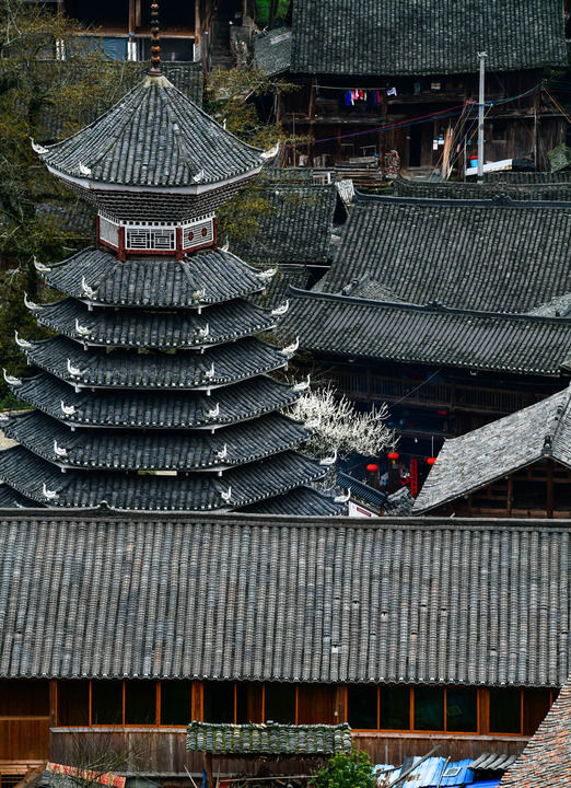 2024年3月17日拍攝的貴州省榕江縣栽麻鎮(zhèn)大利侗寨鼓樓。鼓樓是侗族的文化符號之一,每個(gè)侗寨至少有一座,是侗族人民集中議事、評斷是非的公共場所,也是侗家人出生和去世時(shí)必須要停留的場地。