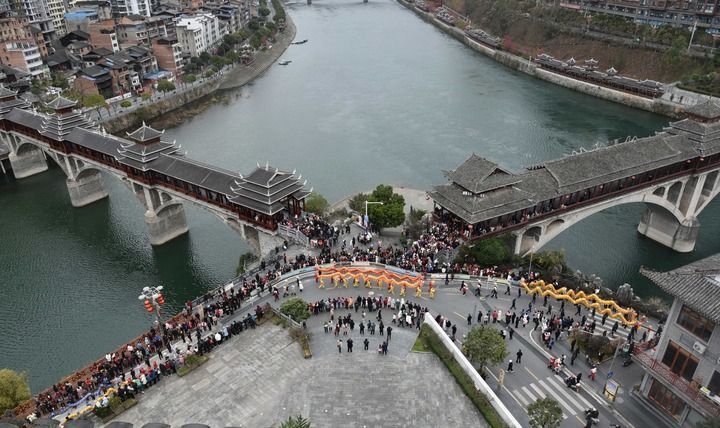 2024年2月22日,在貴州省黔東南苗族侗族自治州錦屏縣,舞龍隊(duì)經(jīng)過兩座風(fēng)雨橋的交匯處。風(fēng)雨橋,又稱“花橋”,是侗族的標(biāo)志性建筑之一。因橋上建有廊和亭,既可行人又可遮蔽風(fēng)雨,故稱風(fēng)雨橋。其以木為料、以榫銜接,是侗族橋梁建筑藝術(shù)的結(jié)晶。鼓樓、花橋的侗族木構(gòu)建筑營造技藝被列入國家級非物質(zhì)文化遺產(chǎn)代表性項(xiàng)目。
