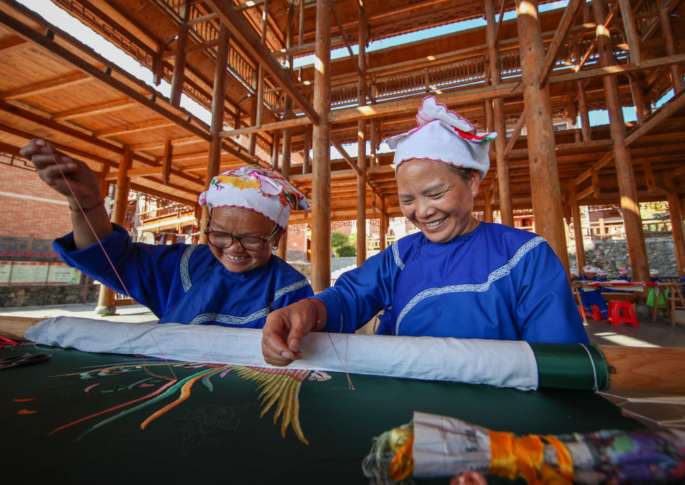 2021年9月27日,貴州省鎮(zhèn)遠(yuǎn)縣報(bào)京鄉(xiāng)報(bào)京村村民邰木香(右)在制作侗繡。邰木香將侗族的民間故事以刺繡形式展現(xiàn)出來,還先后開發(fā)出傳統(tǒng)與現(xiàn)代相結(jié)合的侗族服飾、工藝包、繡花鞋、圍腰、頭巾、枕巾等系列產(chǎn)品,深受國內(nèi)外客商的青睞,致富的同時(shí)帶動(dòng)當(dāng)?shù)?00多名繡娘實(shí)現(xiàn)就業(yè)增收。
