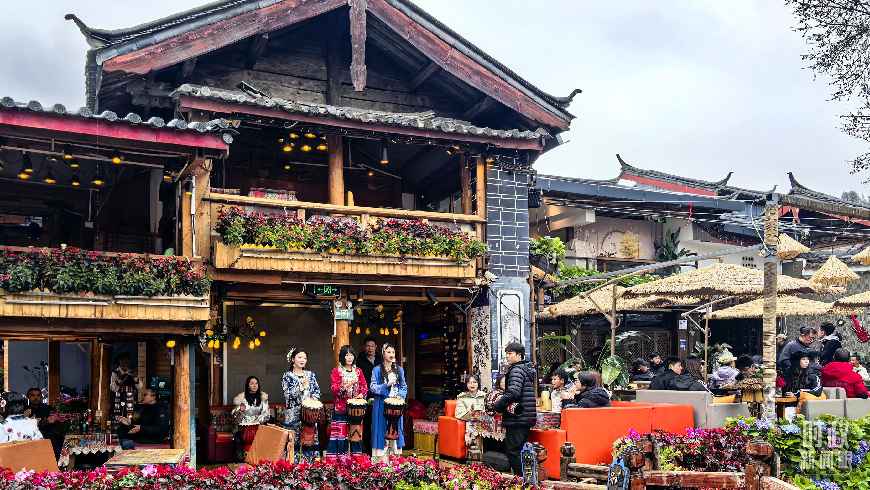 古城商鋪門口的手鼓演奏。(總臺(tái)央視記者鄂介甫拍攝)