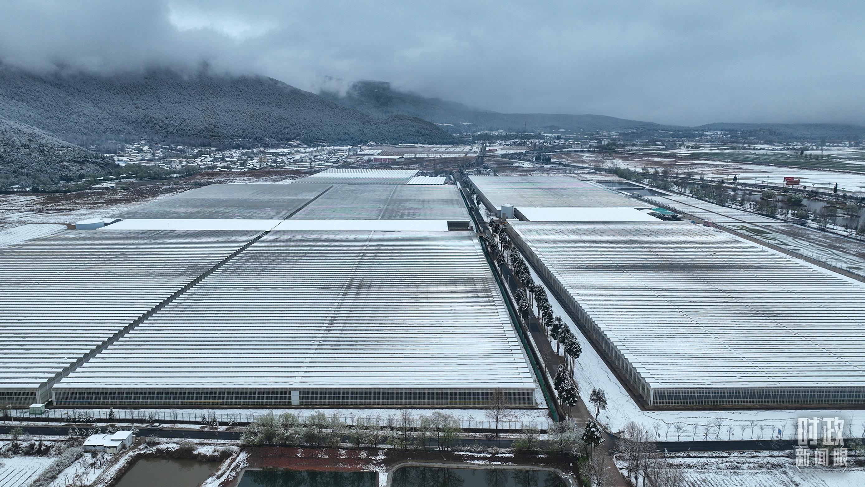 銀裝素裹的麗江現(xiàn)代花卉產(chǎn)業(yè)園。(總臺(tái)央視記者郭鴻拍攝)