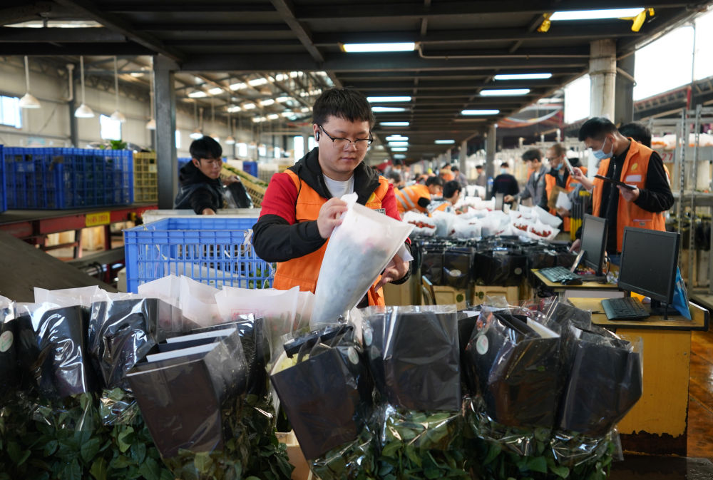 2022年11月11日,工作人員在昆明斗南花市給鮮花貼標(biāo)簽??爝f物流時效不斷優(yōu)化、冷鏈運輸技術(shù)持續(xù)提升,也為中國鮮花加速“出?!北q{護(hù)航。