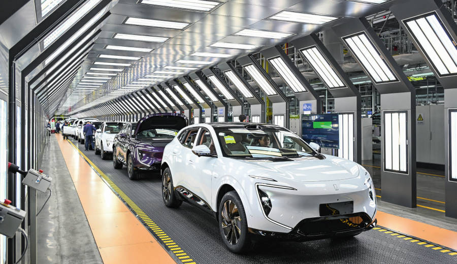 位于重慶市渝北區(qū)的長(zhǎng)安汽車(chē)數(shù)智工廠總裝車(chē)間拍攝的即將下線的新能源汽車(chē)(2025 年 3 月 6 日攝) 王全超攝 / 本刊