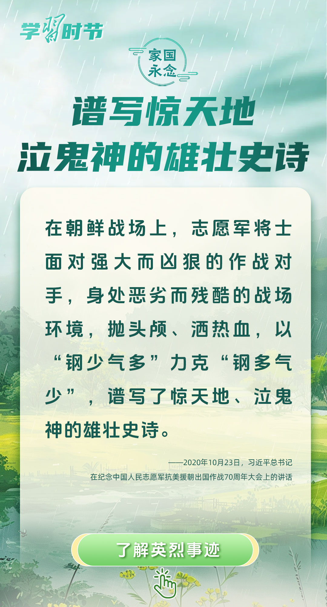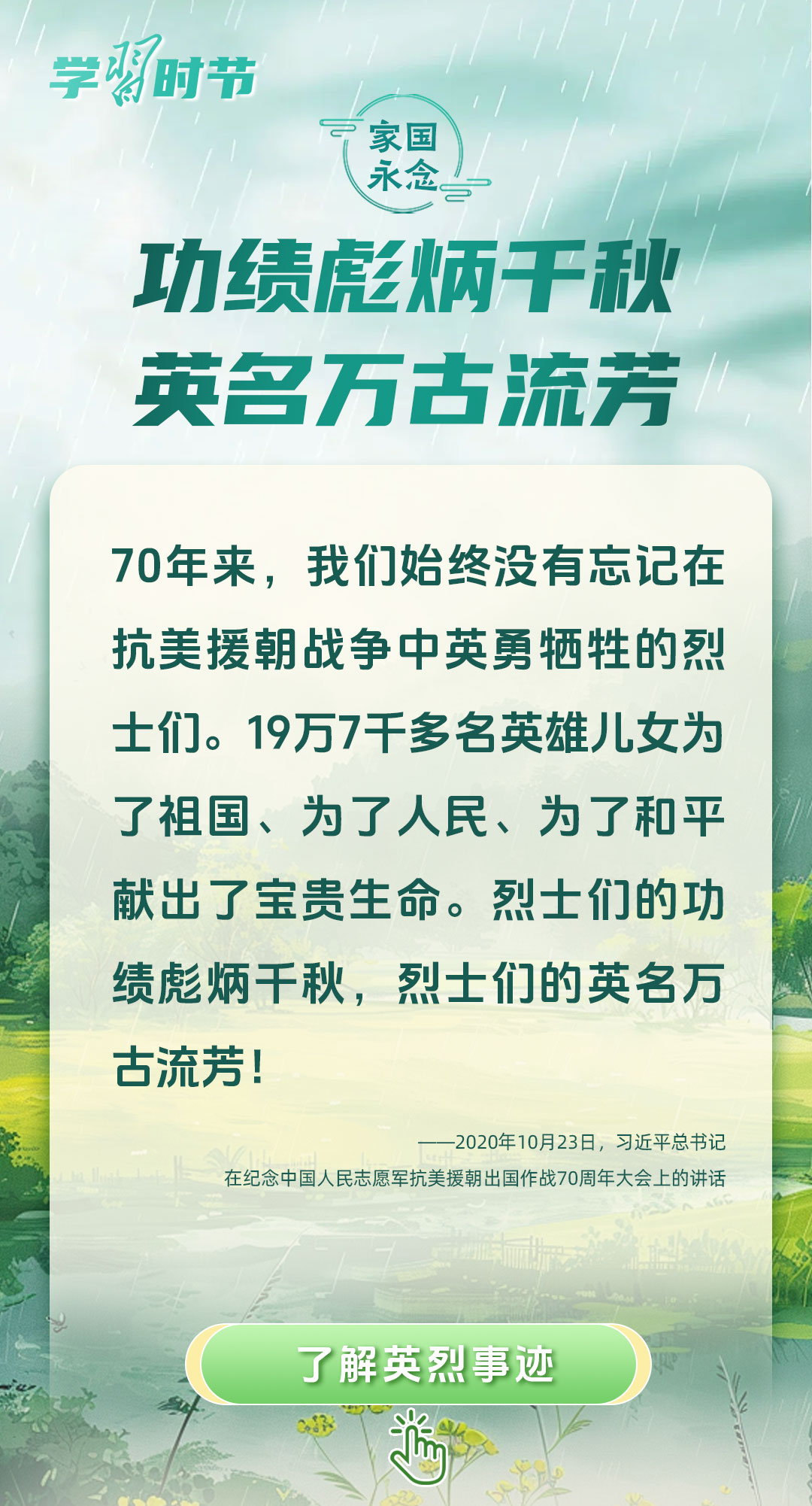 今年是中國人民抗日戰(zhàn)爭暨世界反法西斯戰(zhàn)爭勝利80周年、中國人民志愿軍抗美援朝出國作戰(zhàn)75周年。習(xí)近平總書記曾說:“對(duì)一切為國家、為民族、為和平付出寶貴生命的人們,不管時(shí)代怎樣變化,我們都要永遠(yuǎn)銘記他們的犧牲和奉獻(xiàn)。”今天我們所擁有的一切,無不凝結(jié)著英雄、英烈們的奉獻(xiàn)付出乃至巨大犧牲。