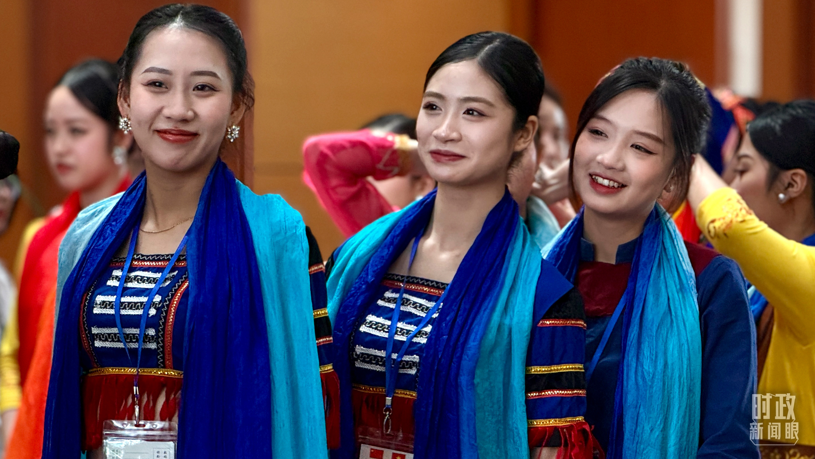 當?shù)厍嗄晟碇褡宸b等待迎接習(xí)近平總書記。(總臺央視記者謝曉光拍攝)