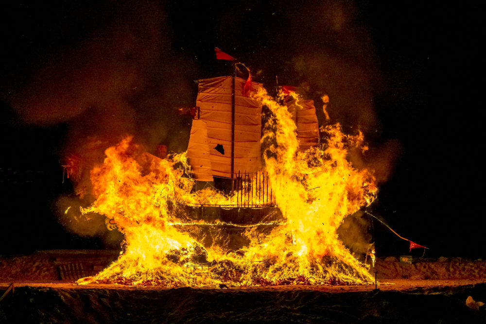 送王船是廣泛流傳于我國閩南地區(qū)和馬來西亞馬六甲沿海地區(qū)禳災(zāi)祈安的民俗活動。2020年,中國與馬來西亞聯(lián)合申報的“送王船——有關(guān)人與海洋可持續(xù)聯(lián)系的儀式及相關(guān)實(shí)踐”項目,被列入聯(lián)合國教科文組織人類非物質(zhì)文化遺產(chǎn)代表作名錄。這是2020年11月16日,在馬來西亞馬六甲,人們點(diǎn)燃“國安號”王船。