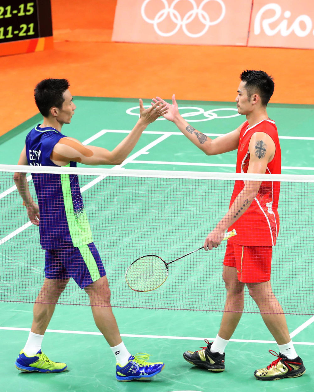 2016年8月19日,里約奧運(yùn)會羽毛球男子單打半決賽后,馬來西亞選手李宗偉(左)和中國選手林丹握手致意。