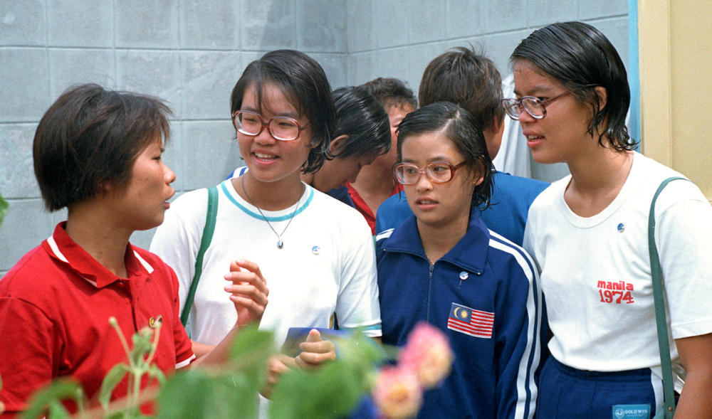 1975年8月2日至8月10日,北京國際游泳、跳水友好邀請賽舉行。一同參加這次邀請賽的馬來西亞游泳三姐妹林寶齡(前右二)、林愛齡(前右一)、林勇齡(左二)和中國運(yùn)動員葉玩嫦親切交談。