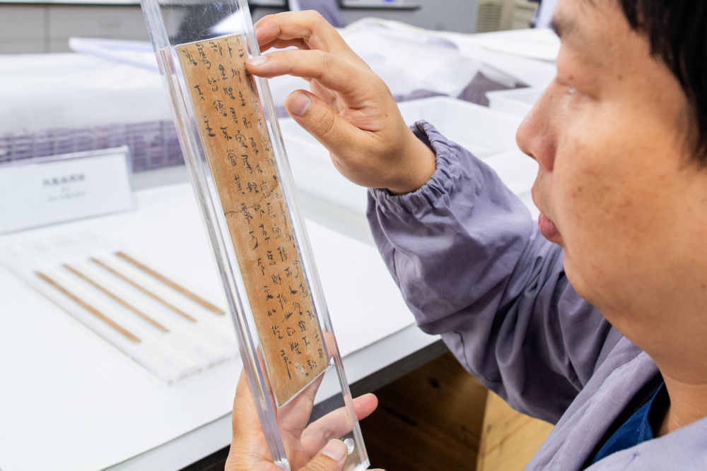 2023年5月20日,湖北荊州文物保護中心的修復(fù)人員史少華在查看修復(fù)完成的簡牘。荊州文物保護中心是我國簡牘修復(fù)領(lǐng)域?qū)嵙ψ顝姷臋C構(gòu)之一,近年來累計完成13萬多枚竹木簡牘的脫水工作,飽水簡牘修復(fù)量占全國90%以上。