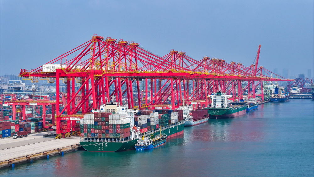 輪船在山東港口日照港集裝箱碼頭停泊作業(yè)(無(wú)人機(jī)照片,2024年8月22日攝)。新華社記者 李紫恒 攝