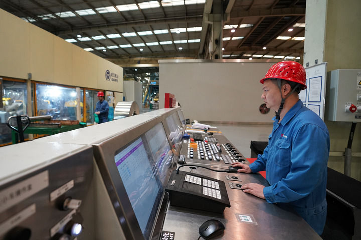 工作人員在太鋼不銹鋼精密帶鋼有限公司車(chē)間作業(yè)(2023年10月24日攝)。新華社記者 詹彥 攝
