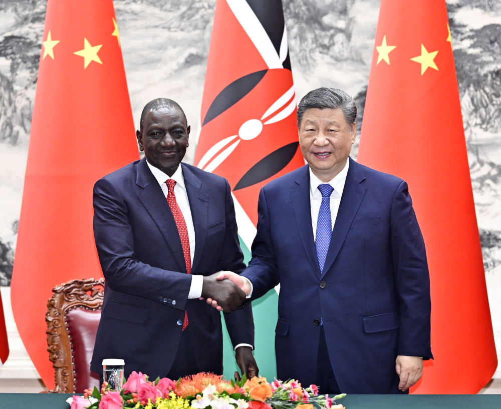 4月24日上午,國家主席習近平在北京人民大會堂同來華進行國事訪問的肯尼亞總統(tǒng)魯托舉行會談。這是習近平同魯托握手。