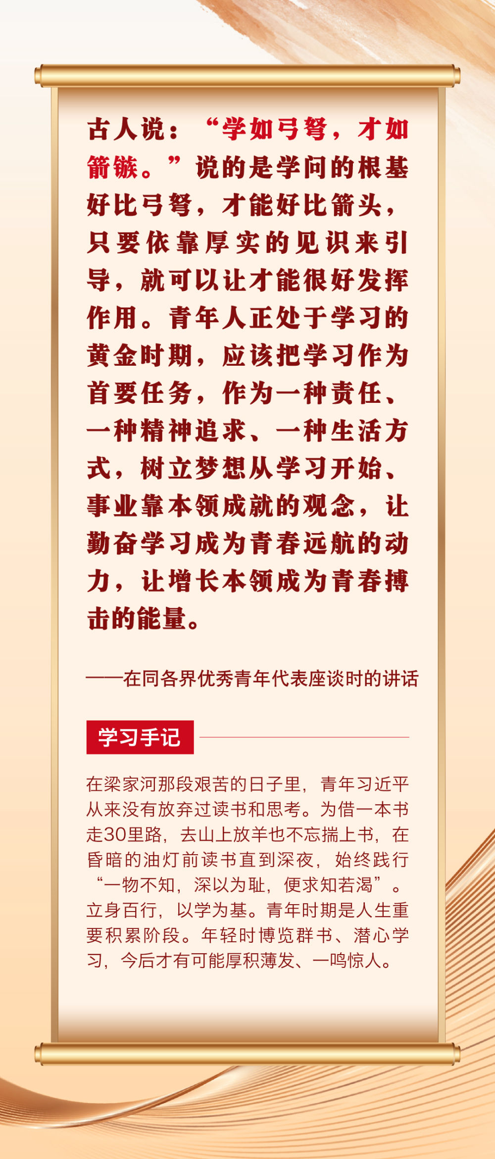 “青年者,國(guó)家之魂?!鼻嗄暌淮院畏N精神風(fēng)貌站上時(shí)代舞臺(tái),關(guān)乎祖國(guó)的明天、民族的未來(lái)。黨的十八大以來(lái),習(xí)近平總書記圍繞青年成長(zhǎng)成才作出許多重要論述。其中,有信手拈來(lái)的精妙典故,有貫古通今的廣征博引,引領(lǐng)廣大青年不斷在中華文化的浸潤(rùn)中堅(jiān)定中國(guó)心、涵養(yǎng)民族魂,成長(zhǎng)為堪當(dāng)復(fù)興重任的時(shí)代新人。