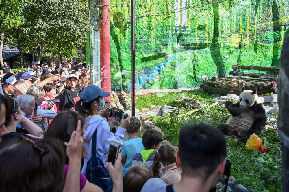 2024年7月31日,觀眾在俄羅斯莫斯科動物園拍攝大熊貓“如意”。當(dāng)日,莫斯科動物園為來自中國的大熊貓“如意”慶祝生日。雄性大熊貓“如意”2016年7月31日出生于中國四川雅安碧峰峽基地,它和大熊貓“丁丁”于2019年4月29日抵達莫斯科,開啟為期15年的旅居生活。
