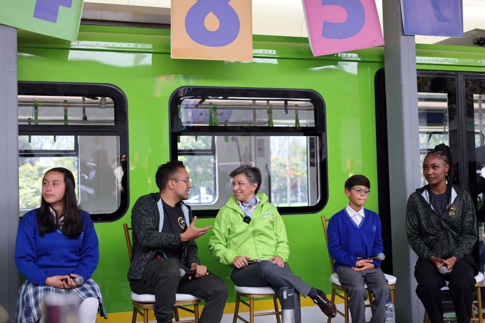 2023年8月10日,哥倫比亞波哥大市長克勞迪婭·洛佩斯(中)在波哥大地鐵的模型車廂旁跟參加活動的師生交流。按照計劃,由中企承建和運營的波哥大地鐵一號線將在2028年正式投入運營。